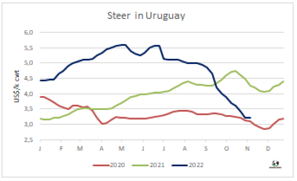 10月烏拉圭對歐盟冰鮮牛肉出口均價下跌了3%