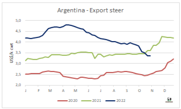 左派總統(tǒng)候選人Lula Da Silva在周日的選舉中獲勝,最初對巴西匯率產(chǎn)生了負面影響,之后雷亞爾升值,從而推高了南方共同市場牛價。本周南方共同市場閹牛價格指數(shù)上漲了2美分至3.28美元/公斤,打破了連續(xù)三周的下跌勢頭。本周巴西雷亞爾增值2.9%,中和了本地市場育肥牛價格的疲軟,美元價格上漲了4美分至3.27美元/公斤。阿根廷出口閹牛價格繼續(xù)下跌,本周下跌了2美分至3.65美元/公斤。烏拉圭和巴拉圭牛價保持穩(wěn)定,烏拉圭閹牛參考價3.2美元/公斤,巴拉圭參考價2.8美元/公斤。
