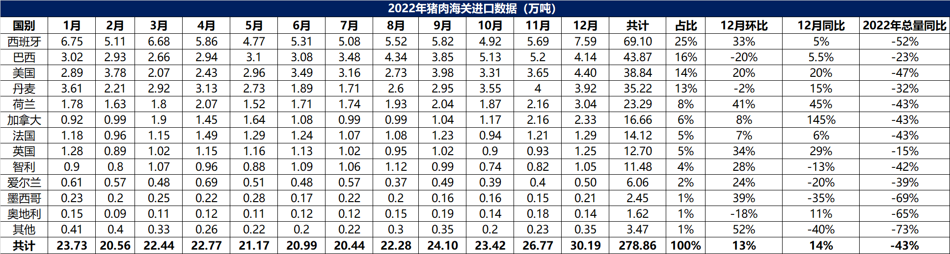 2022年12月中國(guó)主港豬肉進(jìn)口量30.19萬(wàn)噸,環(huán)比+13%,同比+14%。全年中國(guó)主港豬肉進(jìn)口總量278.86萬(wàn)噸,同比-43%。12月豬肉前四大進(jìn)口來(lái)源國(guó)依然是西班牙、巴西、美國(guó)、丹麥,分別占當(dāng)月進(jìn)口量的25%、16%、14%、13%。