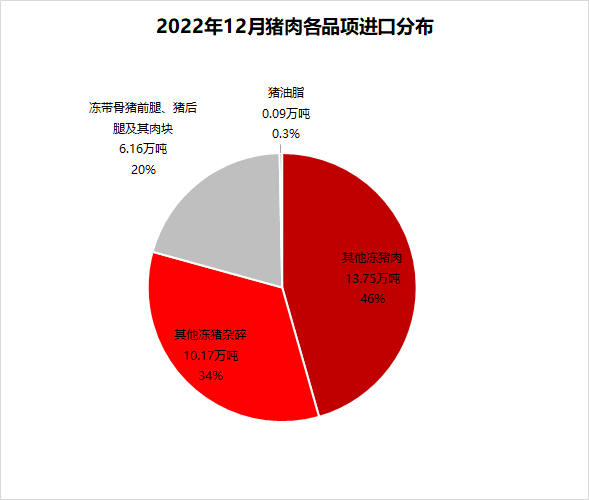 12月豬肉進(jìn)口品項(xiàng)以骨類和其他帶骨豬肉為主,占進(jìn)口量的46%;豬副產(chǎn)類占比34%;主塊肉和油脂類占比共計(jì)20%。