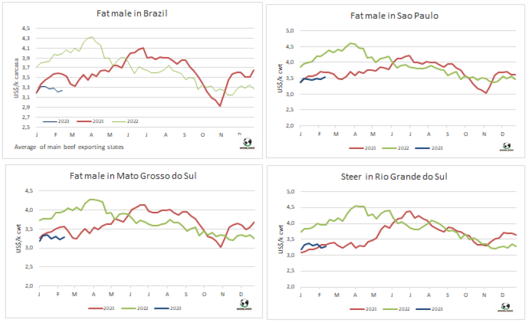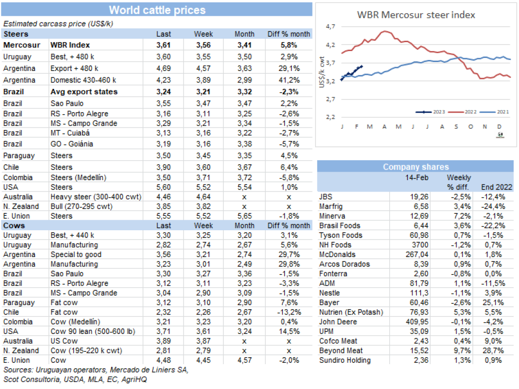 由于活牛價格急劇上漲,政府為控制不讓價格轉(zhuǎn)移到消費端者身上,給屠企施壓。周一政府重新啟動了一項“關(guān)愛肉”計劃,通過該計劃,企業(yè)必須承諾以低于當?shù)厥袌?span>30%左右的價格分銷七項部位肉。昨天,也就是周二,新加一項要求是這些公司必須每月貢獻1.5萬噸的部位肉。由于牛肉是食品和飲料類別中權(quán)重最大的商品,占消費者價格指數(shù)(CPI)的24%,經(jīng)濟部希望能影響2月的通貨膨脹率。與此同時,政府還對海關(guān)和聯(lián)邦公共收入管理局施加壓力。政府發(fā)布的一份報告稱,他們發(fā)現(xiàn)“在2021年至2022年期間,523份牛肉出口許可證存在虛開發(fā)票的操作”。報告指出,此類操作涉及22家出口商,“少開發(fā)票”的總額為1190萬美元(占這兩年出口額的0.2%)。一些公司本周無法獲得出口許可。此外,已經(jīng)廢除的2021年6月開始實施的肉類出口配額也被恢復(fù)。這一配額最初為2.9萬噸,并加上關(guān)稅配額,后來變得更加靈活,達3.9萬噸,而現(xiàn)在又回到了原來的數(shù)量。就此而言,為了讓國內(nèi)市場獲得便宜的肉類,出口企業(yè)正在讓步,例如將針扒和肩胛排除在出口禁令之外,建立一個特殊的牛肉出口用匯率——比官方匯率高出1美元,以及只允許擁有屠宰場的公司授予出口許可證等其他要求。