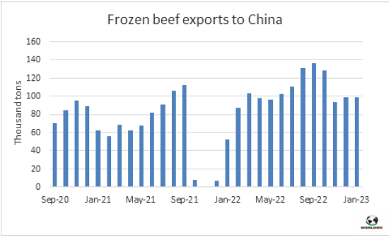 1月全球牛肉對中國出口量是一年以來最低