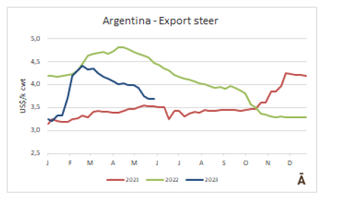 cwt,跌至1月以來最低水平。由于巴西價格大跌(-8%),加上巴西貨幣雷亞爾的貶值,巴西出口州的平均牛價由$3.09/kg cwt跌至$2.92/kg cwt。烏拉圭和阿根廷的市場的價格下降幅度要小得多。