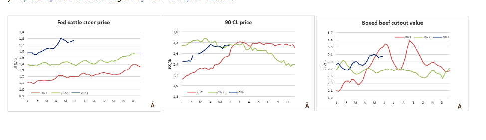 同時,巴西的9切的前部位肉的交易價格為$5,100-$5,200,巴拉圭的交易價格為$5,200-$5,400,交易量很低。這兩個國家的80VL碎肉的參考價格為$3,200-$3,300。