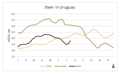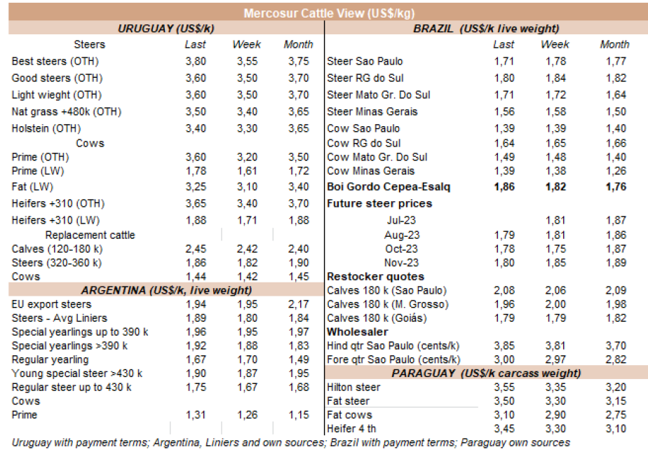 世界牛肉報告顯示過去一周南方共同市場閹牛價格上漲4美分至3.37美元/公斤。牛肉屠宰量增加,烏拉圭上漲了7%,巴拉圭上漲了6%,阿根廷市場保持穩(wěn)定,而巴西出口平均數(shù)減少了1%(-3美分)至每公斤3.08美元。雷亞爾對美元的升值(+1%)阻止了該地區(qū)牛價格的進(jìn)一步下跌。
