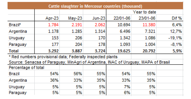 盡管國家統(tǒng)計和普查研究所(INDEC)的數(shù)據(jù)明天才能發(fā)布,根據(jù)SENASA衛(wèi)生服務(wù)局的數(shù)據(jù)估計,6月份帶骨去骨牛肉出口量為64171噸,比5月份相比高1%。中國的出口量有所下降,盡管其出口額在2023年仍然是迄今為止的第二高,超過50200噸。與此同時,與2022/23年關(guān)稅配額的關(guān)閉一致,對歐盟的出口量有所下降。與此同時,以色列的出口量有所恢復(fù),出貨量近4300噸,比上月增加183%。對智利和美國的出口也大幅增長,與上月相比分別增長了44%和32%