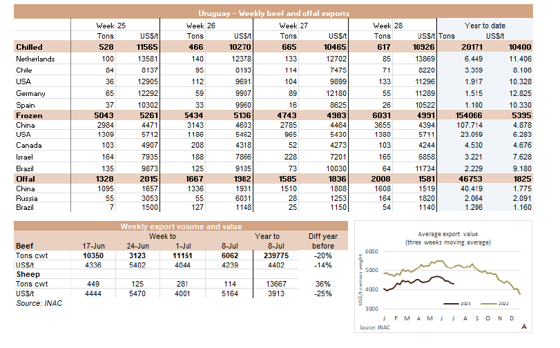 以烏拉圭為例,以色列進(jìn)口商通過施壓降低屠宰合同的價格,一位出口商警告稱:“如果他們不設(shè)法降低價值,他們就會停止生產(chǎn)”。一位進(jìn)口商指出,這種“壓力”也影響了與巴西的合同。另一方面,與烏拉圭協(xié)定一天屠宰350頭,價格是7000元/噸。阿根廷方面,合同還是維持8000美元FOB/噸。