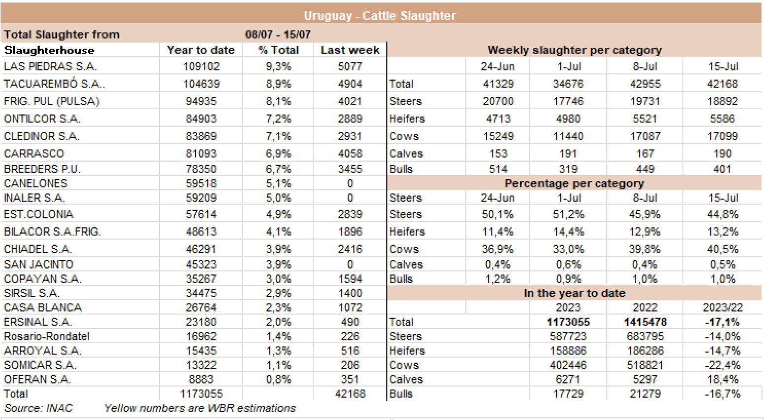 據(jù)INAC報道,在7月9日至15日的一周屠宰量42168頭牛,與七天前(42168頭)相比僅減少了1.8%。工業(yè)公牛增加了18893頭,與前一周相比下降了4.2%,而奶牛的數(shù)量17099保持穩(wěn)定。今年到目前為止,牛的屠宰總量為11.30億頭,比去年同期降低了18%。