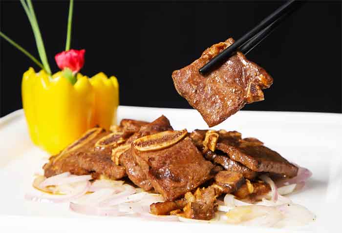 牛仔骨重要的附加價值就在于“帶骨”“有骨氣”,帶骨煎制或烤制,肉香更為濃郁,加上我們是喜歡啃硬骨頭的。比如“帶骨牛小排Karubi”烤肉,這款烤肉需要肉與骨一起切,可在其冷凍狀態(tài)時鋸成想要的厚度。韓式烤肉中就常有帶骨Karubi,一般將牛仔骨的三支骨頭沿垂直方向切成骨長約4厘米,大小片切時約8厘米的平板狀。切成扁平狀時,為使頭尾的切口處平整,需把肉切薄,去除肉片表面附著的殘骨。注意不要將附著在骨頭周圍的霜降大理石紋精肉與骨頭分離,小心地沿著肉骨交接處劃下約5毫米深的刀痕,可使醬料沿著刀痕充分滲入整塊肉,這是韓式烤肉的美味秘訣。在宴會菜單或什錦拼盤中加入牛仔骨,會令人覺得十分豪華。特別是長8厘米的大片牛仔骨占滿整個烤肉網(wǎng)的擺法,不禁令人贊嘆,價值感滿滿。