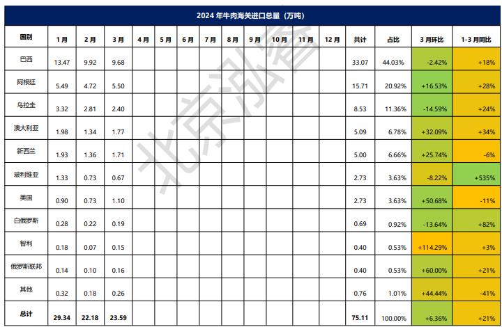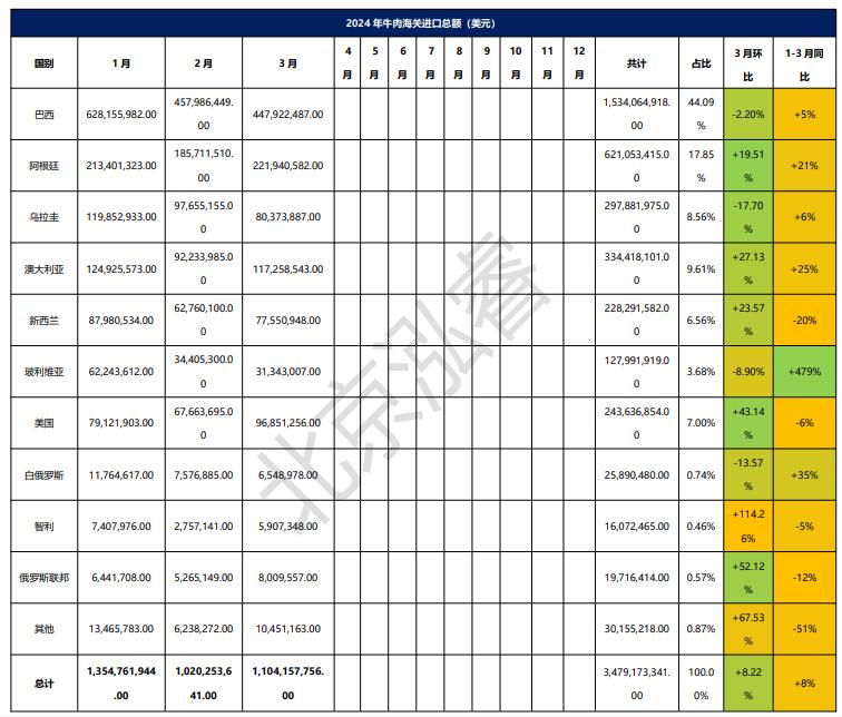 2024年1-3月冷凍牛肉進(jìn)口概況