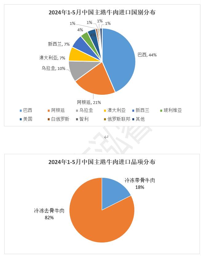 從進(jìn)口品項(xiàng)看,冷凍帶骨牛肉1-5月平均單價(jià)2684美元/噸,進(jìn)口來源主要分布在烏拉圭、阿根廷、新西蘭和澳大利亞。冷凍去骨牛肉1-5月進(jìn)口平均單價(jià)5150美元/噸,進(jìn)口來源主要分布在巴西、阿根廷、澳大利亞、烏拉圭和美國。