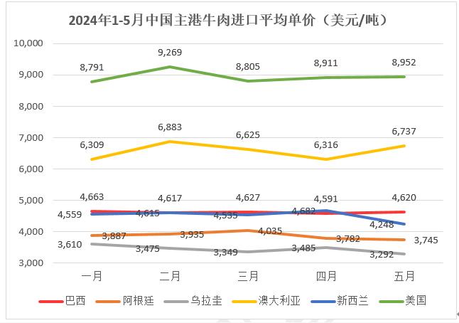 從進(jìn)口單價(jià)看,巴西1-5月平均單價(jià)為4627美元/噸,去年同期為5232美元/噸,阿根廷1-5月平均單價(jià)為3879美元/噸,去年同期為4215美元/噸,烏拉圭1-5月平均單價(jià)為3460美元/噸,去年同期為4120美元/噸,美國1-5月平均單價(jià)為8927美元/噸,去年同期為8421元/噸。各國進(jìn)口平均單價(jià)為4633美元/噸,去年同期為5188美元/噸??傮w來看,牛肉進(jìn)口單價(jià)同比均呈下降趨勢。