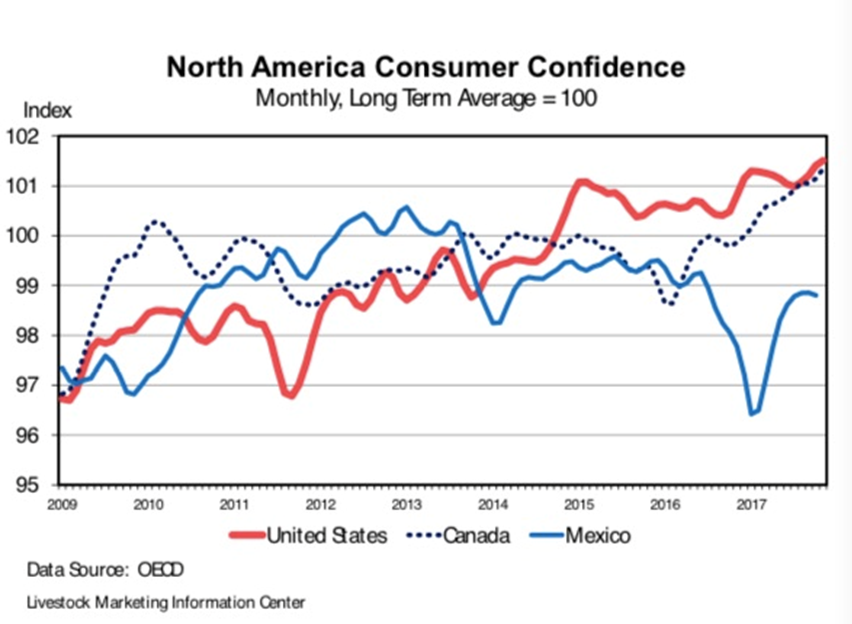 消費者信心與經(jīng)濟增長密切相關(guān),相對強勁的數(shù)字預(yù)示著紅肉需求量的增長。在最近六年里,美國消費者信心趨勢走高。美國消費者信心指數(shù)(CCI),被作為經(jīng)濟合作與發(fā)展組織(OECD)的標準和指標,可見下附圖表1。該圖表來自圣路易斯聯(lián)邦儲備銀行數(shù)據(jù)庫(弗萊德,數(shù)據(jù)截止到2017年10月)。經(jīng)濟合作與發(fā)展組織(OECD)11月的美國消費者信心指數(shù)(CCI)為101.5,是自2000年12月以來最高的一個月。2009年2月,是上次經(jīng)濟衰退的最低點,美國消費者信心指數(shù)(CCI)為96.7.