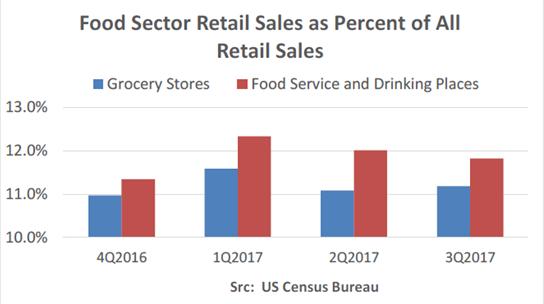 自2008-2009年經(jīng)濟(jì)大衰退以來,牛肉需求的艱難表現(xiàn)使零售銷售在食品行業(yè)增長節(jié)奏非常之緩慢。11月的零售店銷售額較上年同期增長了3.4%,但由于今年頭兩個月和六月與七月的增長乏力,今年的銷售額可能不會超過1.5%。餐飲服務(wù)零售增長趨勢敲響了更重的警鐘。 11月餐飲服務(wù)的銷售增長同比只有2.5%,10月只有1.5%。和2015年的8%和2016年的6%的增長相比,2017年,餐飲服務(wù)銷售較去年增長只有2.3%,
