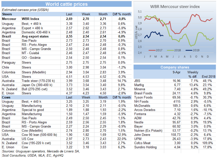 阿根廷比索疲軟拉低了南方共同市場(chǎng)閹牛價(jià)格,本期閹牛指數(shù)下跌1美分到2.69美金。阿根廷比索本周又貶值2.2%,雖然出口閹牛比索價(jià)格并沒(méi)有變化,換算成美金跌了5美分到2.57美金,巴西國(guó)內(nèi)牛價(jià)堅(jiān)挺,美金牛價(jià)漲了1美分到2.55,巴拉圭牛價(jià)保持在2.75美金,烏拉圭價(jià)格稍微下行,跌了2美分到2.38美金。