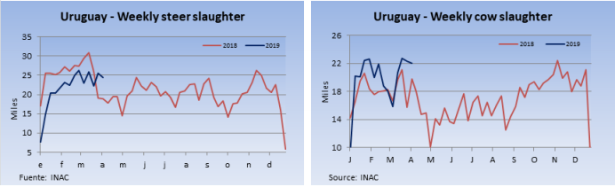 上漲的主要是面向國(guó)內(nèi)市場(chǎng)的待宰牛,小牛犢和小閹牛價(jià)格自年初以來(lái)漲了40%,最近由于價(jià)格回調(diào),總漲幅應(yīng)該在35%左右,年初預(yù)計(jì)出口活牛價(jià)格會(huì)上漲15%,但目前也已經(jīng)遠(yuǎn)遠(yuǎn)超過(guò)這個(gè)漲幅。雖然屠宰量還是很高,但從結(jié)構(gòu)來(lái)看屠宰增加的主要是母牛,二月屠宰量同比增加29%,而小牛犢和閹牛屠宰量減少了15%。面向本地市場(chǎng)的小牛犢和閹牛供應(yīng)短缺,主要因?yàn)轱曈龍?chǎng)利潤(rùn)率不足而進(jìn)行存欄清盤(pán),同時(shí)夏季良好的飼草情況也使活牛生產(chǎn)商可以等待合理的時(shí)機(jī)出售。