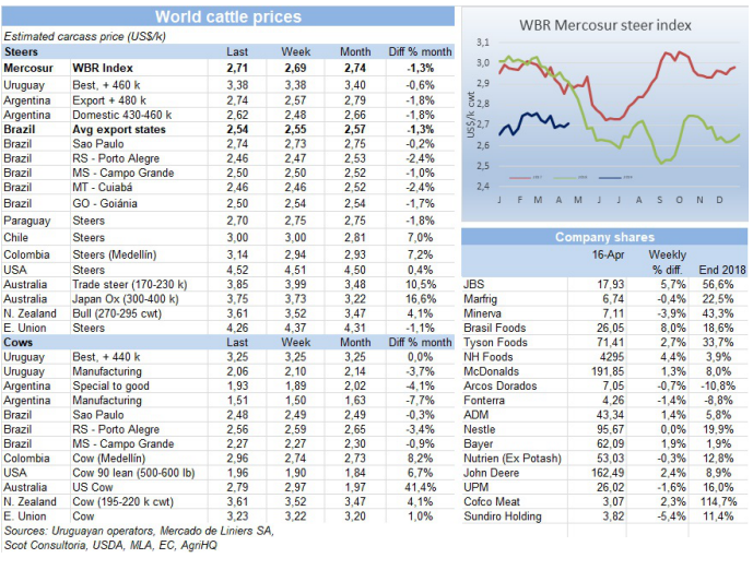 中國市場還很活躍,不過有些產(chǎn)品價格下調(diào)了50美金,非洲豬瘟的影響使肉類蛋白價格大漲。雖然烏拉圭屠宰量還保持在每周5萬頭以上,但工廠不愿意報太長的船期,因為不知道這樣的屠宰節(jié)奏能保持多久。另一個因素是Sial上海展會一個月后要開,今年是5月14-16日。目前巴西牛肉出口香港成交很緩慢,腱子價格不超過3300美金。