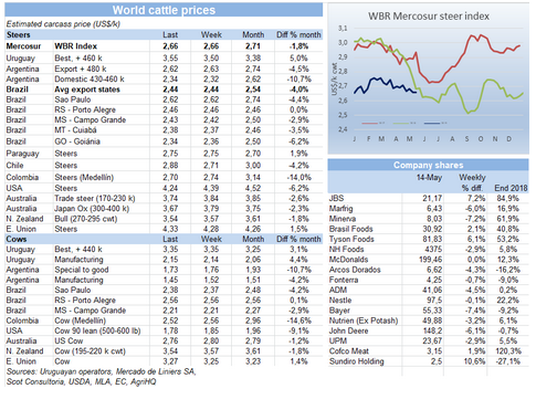 Marfrig的CEO稱,出口中國(guó)市場(chǎng)價(jià)格上漲,有助于支撐烏拉圭活牛價(jià)格,但工廠利潤(rùn)空間還是不大。因?yàn)閮纱笠蛩鼗钆J袌?chǎng)很難達(dá)到平衡,第一育肥牛供應(yīng)量很少,第二冬天即將來臨,冬天供應(yīng)量正常會(huì)下降。中國(guó)非洲豬瘟的惡化催生了很多的投機(jī)者,但Marfrig的策略還是照顧長(zhǎng)期客戶,即使這樣沒法賣出最高的價(jià)格。