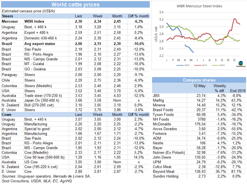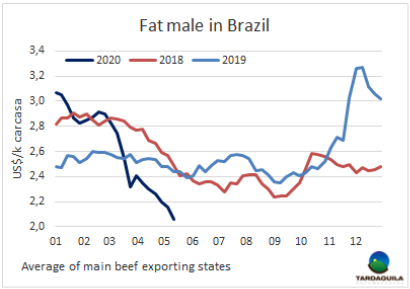 與出口到國內(nèi)市場的工廠相比,直接出口到中國市場的肉類加工廠要多花10雷亞爾采購出口至中國的適齡牛(30個月齡以下),這反映了出口相對于國內(nèi)需求的卓越競爭力。這主要是由于雷亞爾疲軟,昨天雷亞爾兌美元匯率為5.87。在上周日母親節(jié)(通常在每個月的月初)出現(xiàn)額外需求之后,巴西國內(nèi)市場對牛肉興趣不大,新冠疫情危機(jī)中,消費者趨向于選擇更便宜的蛋白質(zhì)。圣保羅育成牛參考價193雷亞爾/15公斤,較上周下跌1美分。預(yù)定時間拉長至9天左右,其他州,例如米納斯吉拉斯,預(yù)定時間拉長至11天。不同地區(qū)價格走勢不同,戈亞尼亞州價格有回漲,參考價在178.5雷亞爾/15公斤。