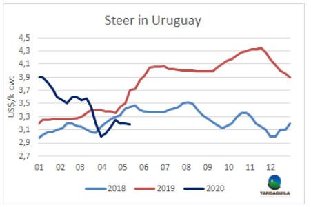 上周牛只屠宰量再次增長,保持從四月前半月開始逐漸恢復(fù)的趨勢。截止59日的一周,牛只屠宰量42390頭,周屠宰量較前一周增長了6300頭,包含51日的假期,較截止425日的一周屠宰量增長2000頭。上周屠宰量的主要增長的是閹牛,因為為481配額準(zhǔn)備的牛只已經(jīng)運抵工廠,但是由于歐洲市場不樂觀,將出口至不同的市場。閹牛屠宰量19942頭,較前一周增長25%,增長了4000頭。母牛屠宰量16919頭,小母牛屠宰量4564頭,均較前一周增長超過10%。屠宰量最大的工廠是 Marfrig-Tacuarembó (4023),NH-BPU(3765)Athena-Carrasco (3759)。Marfrig上周屠宰量11918頭,較前一周增長約1000頭,美麗華兩家工廠屠宰總量7501頭,達(dá)到兩年前屠宰量水平。