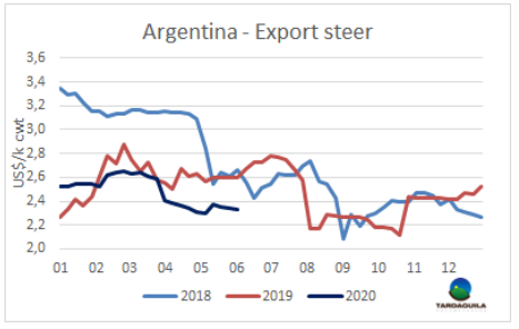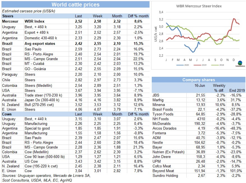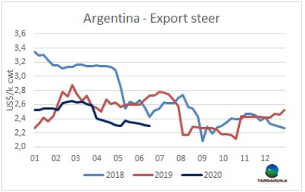 5月閹牛類型價(jià)值降低至1123美元,達(dá)20194月至今13個(gè)月以來(lái)最低。相反,閹牛采購(gòu)價(jià)格上漲了52美元,增長(zhǎng)至887美元,因此兩者之間的差即工業(yè)附加價(jià)值大幅下降,每屠宰一頭牛的工業(yè)附加價(jià)值下降236美元。烏拉圭肉協(xié)稱閹牛類型價(jià)值降低的原因是所有部位肉價(jià)格都有下降,出口方面,高價(jià)值的部位肉出口至歐洲市場(chǎng)困難導(dǎo)致價(jià)格下跌。國(guó)內(nèi)市場(chǎng)胴體、雜碎和副產(chǎn)品的美元價(jià)格也在下跌。閹牛類型價(jià)值是對(duì)一頭重480公斤,產(chǎn)量54%的英國(guó)品種閹牛牛或雜交品種的所有產(chǎn)品和副產(chǎn)品的貿(mào)易價(jià)值的加權(quán)平均值。