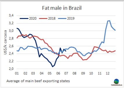 上周巴西主要牛產(chǎn)區(qū)育成牛價格強勁上漲,圣保羅州上周五活牛價格指數(shù)達(dá)218.35雷亞爾/15公斤,較前一周成交價上漲8雷亞爾/15公斤。本周價格增長最明顯的地區(qū)戈亞尼亞(上漲10雷亞爾至207雷亞爾/15公斤),圣保羅(上漲了9.5雷亞爾,上漲至216.5雷亞爾/15公斤)30天內(nèi)付款。圣保羅做出口業(yè)務(wù)的工廠出價高達(dá)220雷亞爾/15公斤。那些做國內(nèi)屠宰的工廠出價低5-10雷亞爾/15公斤。供需雙方都比較樂觀,由于價格預(yù)計將繼續(xù)上漲,牛只供應(yīng)不足,牧草條件依然良好,生產(chǎn)者可以壓欄,價格預(yù)期繼續(xù)上漲。期貨預(yù)訂時間很短,從4天到5天不等。從需求端看,庫存很低,而且接近月初,人們預(yù)計銷售情況會好轉(zhuǎn)。此外,76日起圣保羅酒吧和餐館的可能重新開放,也為市場帶來積極的氣氛。