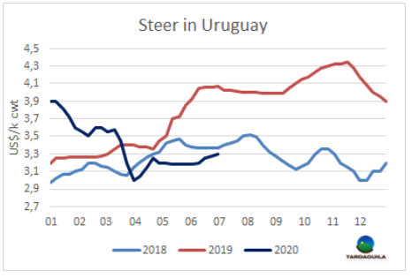 本周南方共同市場閹牛平均價格覆蓋了巴西貨幣疲軟帶來的價格下行。受疫情擴散帶來的擔(dān)憂影響,巴西貨幣兌美元匯率下跌6.1%。盡管巴西育成牛平均價格上漲8雷亞爾/15公斤,上漲至202.8雷亞爾/15公斤,其美元價格下跌了5美分,下跌至2.47美元/公斤。南美地區(qū)其他國家育成牛價格均上行,尤其在阿根廷,活牛供應(yīng)短缺以及冰鮮產(chǎn)品到歐洲的出口價格拉動出口閹牛價格上漲10比索/公斤。美元價格達(dá)到2.35美元/公斤。烏拉圭方面供應(yīng)短缺導(dǎo)致活牛參考價上漲3美分,上漲至3.3美元/公斤。WBR南方市場閹牛價格指數(shù)上漲1美分,至2.6美元/公斤。