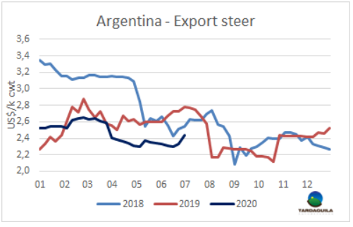 正如WBR預(yù)測,猶太屠宰的重新開始,加上歐洲需求的改善,加劇了牛只短缺,導(dǎo)致活牛價格大幅上漲,每公斤上漲10比索。最好的英國純種閹牛成交價168-173比索/公斤,印度串種閹牛163-170比索/公斤,特優(yōu)種母牛價格上漲了1-2比索,上漲到142-146比索/公斤,工業(yè)母牛價格不變,120-125比索/公斤。