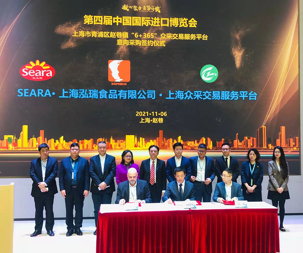 簽約儀式上,巴西集團旗下的SEARA MEATS與北京泓睿&上海泓瑞食品有限公司和上海眾采企業(yè)發(fā)展有限公司簽約。