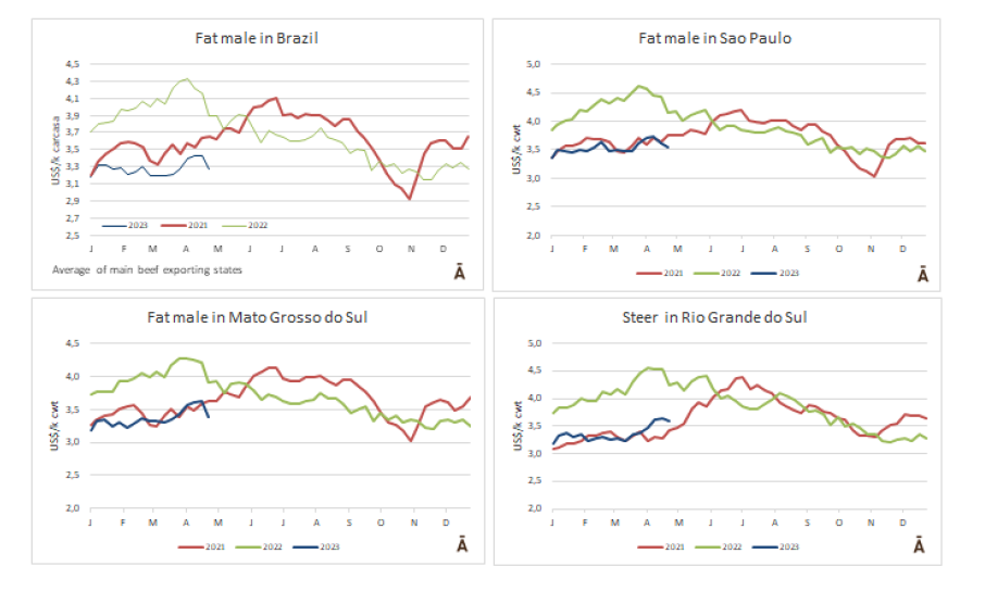 巴西主要養(yǎng)牛州的成品牛平均價格下跌$0.14,至$3.28/kg cwt,回到了3月底的低點。