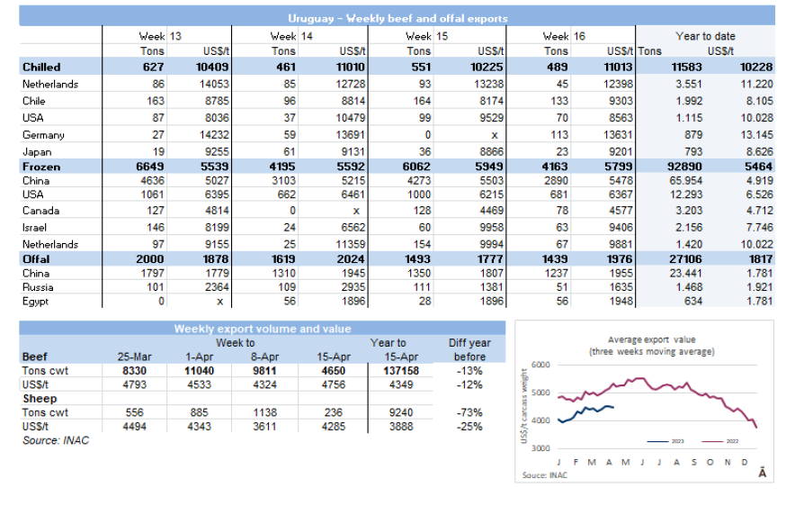 烏拉圭進(jìn)口商還盤價格在牛前后腱出價$6,100,牛霖出價$5,600,眼肉出價$6,500,牛尾出價$6,900,80VL碎肉為每噸$3,500。