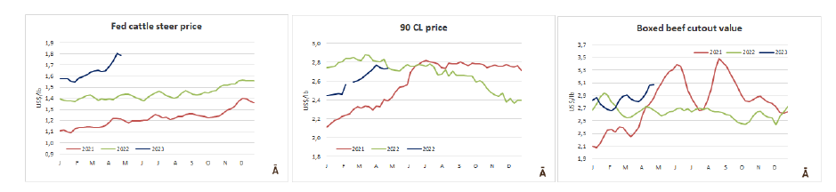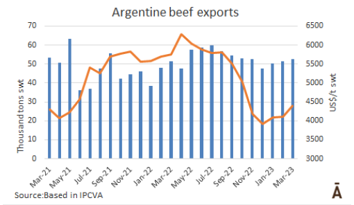 2023年前三個月,牛肉出口量達(dá)到15.6萬噸,出口額為6.542億$,與上年同期相比增長13.2%,出口額下降16.4%。本季度的出口量相當(dāng)于22.18萬噸帶骨牛肉。