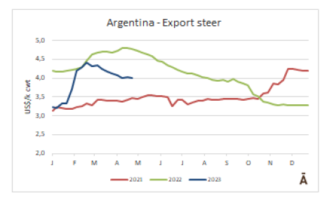 其他國家價格變化不大。阿根廷比出口閹牛由于貨幣貶值,因此出口牛的參考價格下降了$0.04,至$4.36/kg cwt。