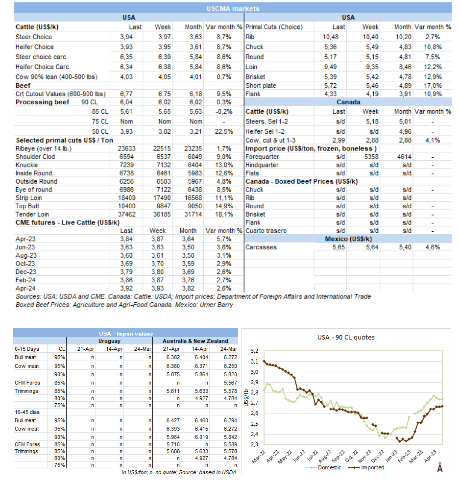 大部分肥牛成交在每公斤$4.20/KG胴體重量左右,而對于280公斤以上的胴體,有些工廠會支付$4.30。就母牛而言,由于市場比較不穩(wěn)定,交易大多在$3.85-$3.95之間進(jìn)行,優(yōu)質(zhì)個體最高可達(dá)$4.00/KG胴體重量。