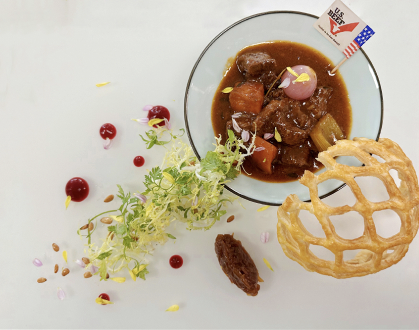 做法:將牛肩胛翼板肉切大塊,用鹽、黑胡椒腌制,煎至上色備用;香菇塊煮軟,與洋蔥丁、芹菜丁、胡蘿卜丁、小干蔥一同放入牛肉鍋中;將大蒜、迷迭香、百里香、八角、丁香、肉豆蔻一同煮至大蒜變軟,加入牛肉鍋中;烤番茄醬至酸味明顯,放入牛肉鍋中,倒入紅酒、雞湯,煮至牛肉變軟、紅酒揮發(fā)、醬汁變稠,裝盤;將蜘蛛菜心、香菜苗、薄荷、松子加橄欖油、鹽、黑胡椒拌勻成松子香料沙拉,與燉好的牛肩胛翼板肉一同擺盤,點(diǎn)綴酥皮網(wǎng)、洋蔥醬即可。