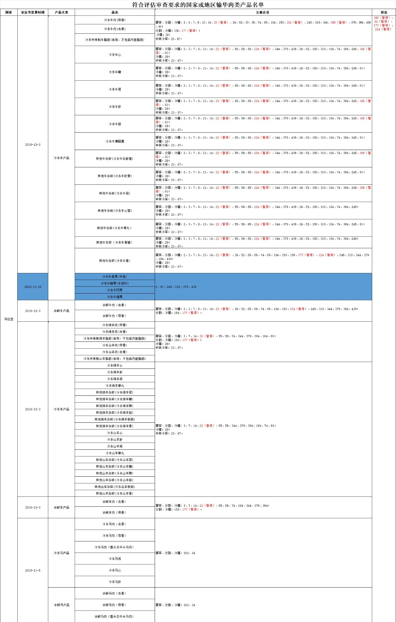 符合評估審查要求的國家或地區(qū)輸華肉類產(chǎn)品名單(2024年5月9日)(新增烏拉圭6家牛肉產(chǎn)品企業(yè))