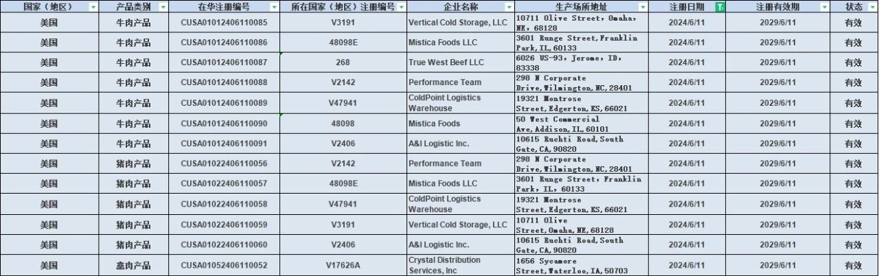 2024年6月11日新增13家美國肉類產(chǎn)品企業(yè),