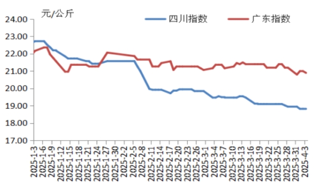 本周,廣東地區(qū)豬肉周均價(jià)為每公斤20.93元,環(huán)比下跌1.7%,同比下跌2.6%,較上周跌幅擴(kuò)大1.5個(gè)百分點(diǎn)。周初豬肉價(jià)格延續(xù)上周下跌走勢(shì)。隨著生豬及豬肉價(jià)格下跌,散養(yǎng)戶和規(guī)模養(yǎng)殖場(chǎng)惜售,生豬出欄量減少,加之清明節(jié)對(duì)豬肉消費(fèi)略有提振,支撐生豬及豬肉價(jià)格微漲。周后期養(yǎng)殖主體逐漸恢復(fù)出欄節(jié)奏,而學(xué)校等團(tuán)體消費(fèi)對(duì)訂單量減少,致使豬肉價(jià)格下跌。總體看,本周廣東地區(qū)豬肉周均價(jià)環(huán)比小幅下跌。