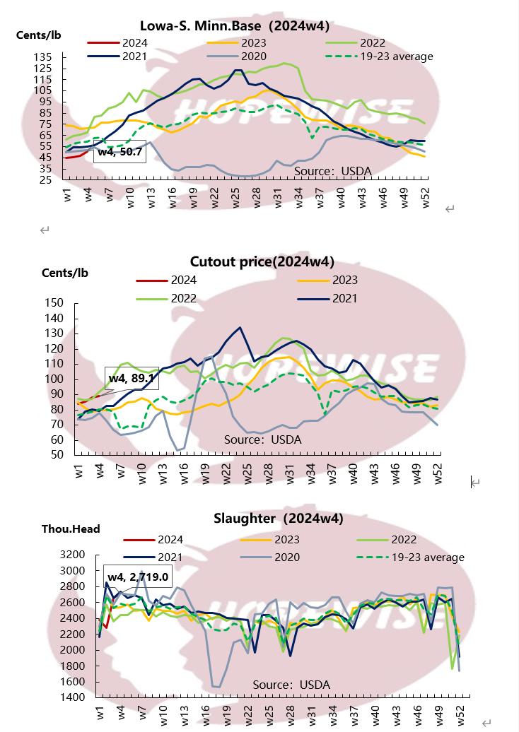 The US live pig price of last week was USD50.67/100lb, with up 8.25% compared with one week before last week but down 28.9% YOY. The cutout price was USD89.1/100lb, with up 1.23% compared with last week and up 11.43% compared with the same term of last year. The weekly slaughter volume was 2.71 million heads with an increase of 3.38%and up 6.78%.